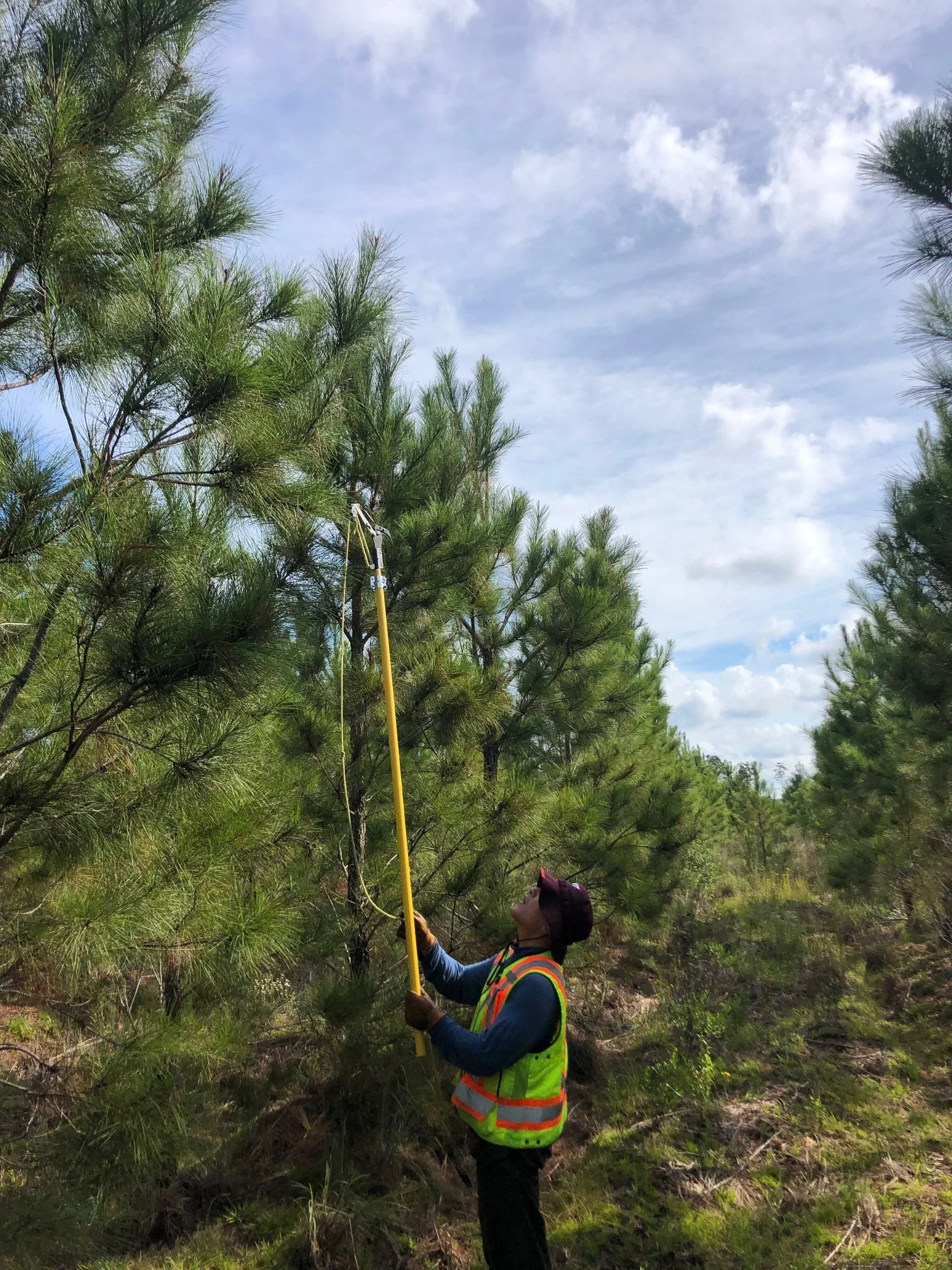 Dan collecting foliage samples using a pole pruner as part of his foliar resorption study, which examines how trees conserve and recycle nutrients internally.